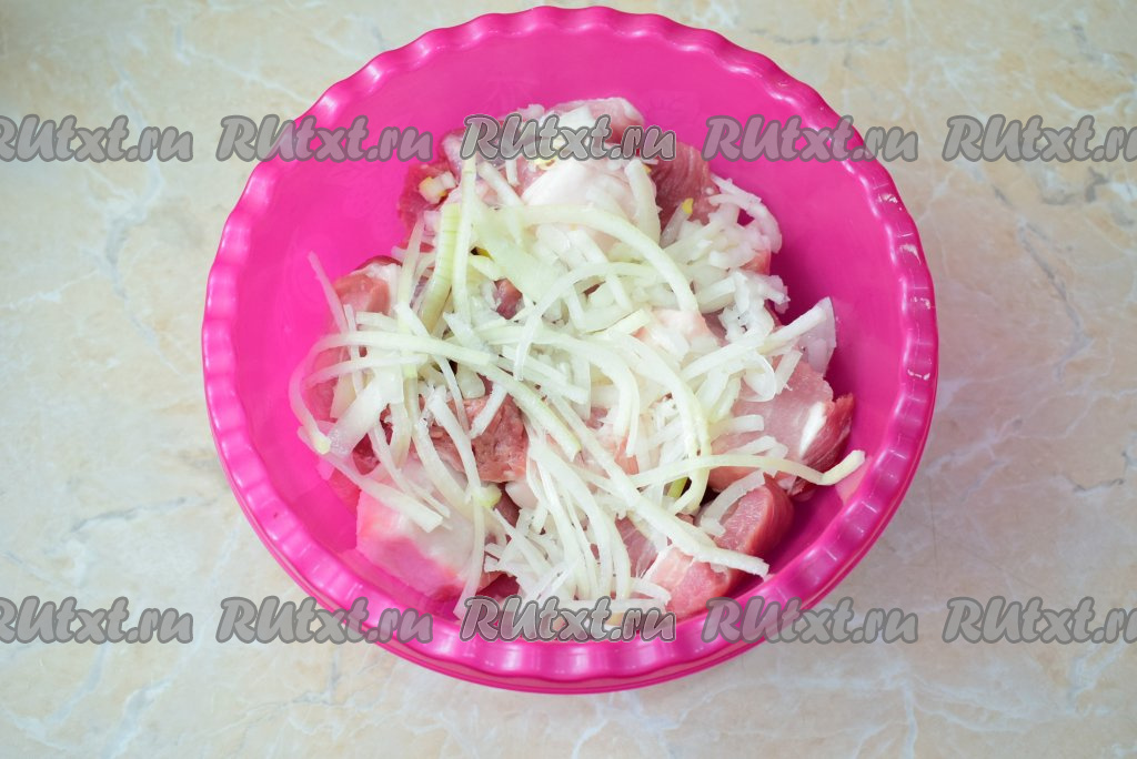 Лук очистите и промойте в холодной воде. Нарежьте лук полукольцами, немного помните его руками, чтобы выделился сок и добавьте в чашу к мясу. Размятый лук быстрее промаринует мясо.