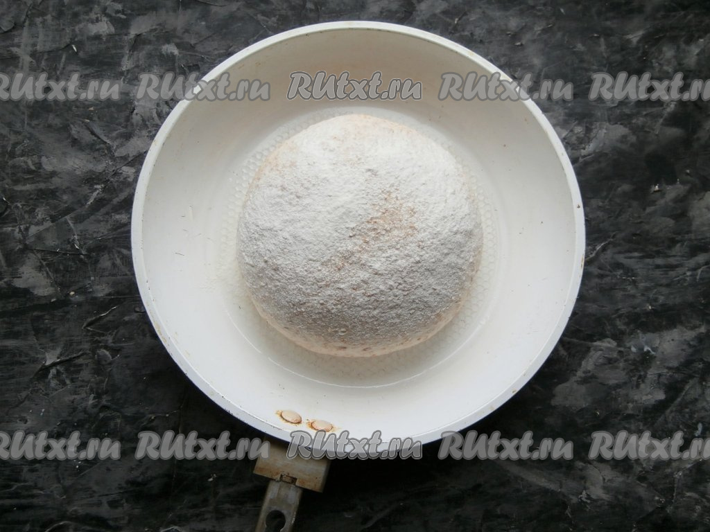 Тесто обмять, сформировать шар и выложить на противень (или в форму, или, как в моём случае, в сковороду без ручки), смазанный растительным маслом. Тесто присыпать немного мукой, прикрыть плёнкой и оставить в тёплом месте на 30 минут.