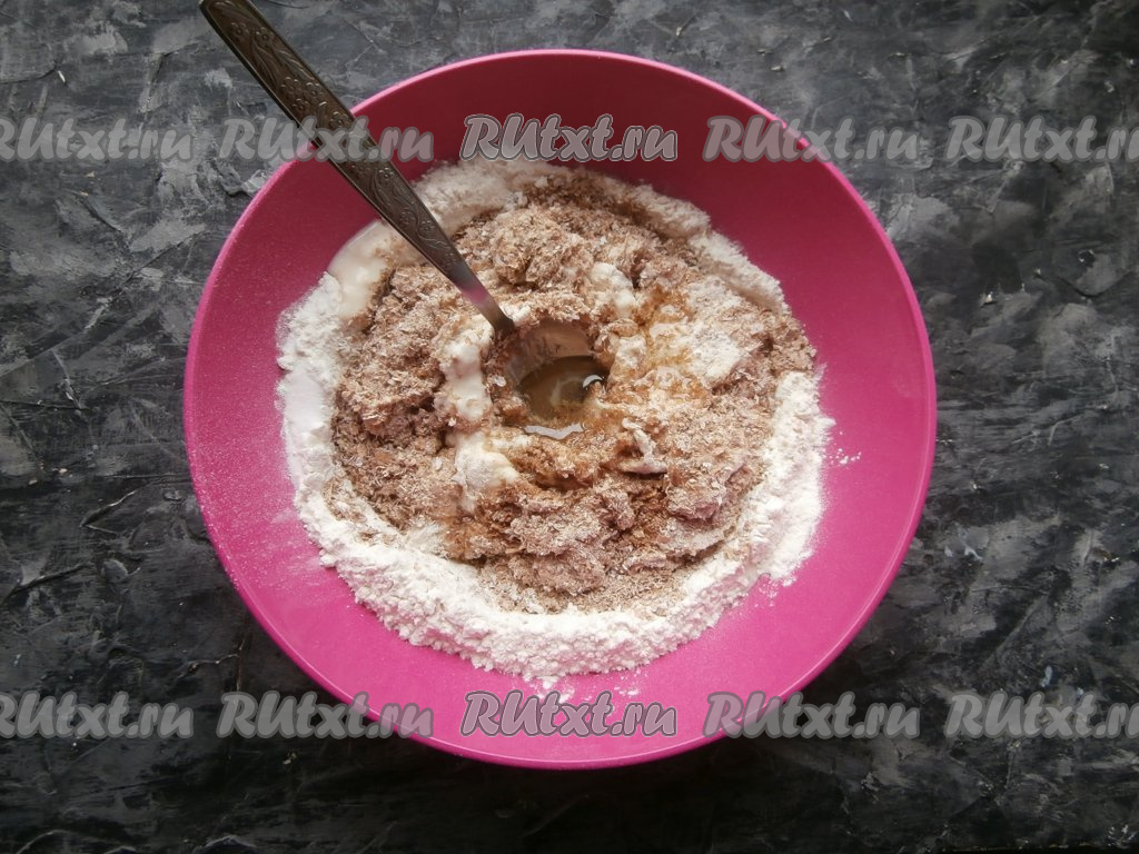 Влить половину тёплой воды и всыпать пшеничные отруби. Воду сильно не нагревайте, она должна быть не более 40 градусов.