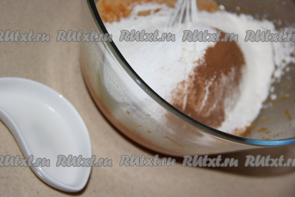 Всыпать муку, корицу и разрыхлитель. Соду погасить лимонным соком.