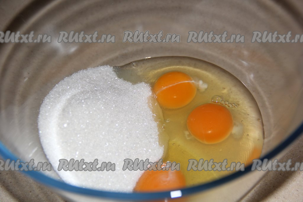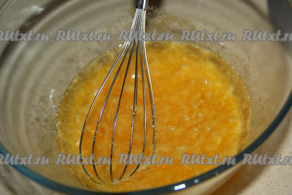 Перемешать массу венчиком до однородного состояния. После этого влить растительное масло и перемешать яично-масляную смесь до однородности.