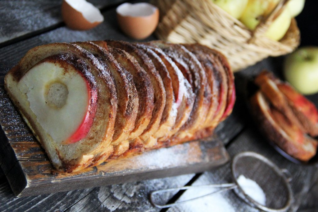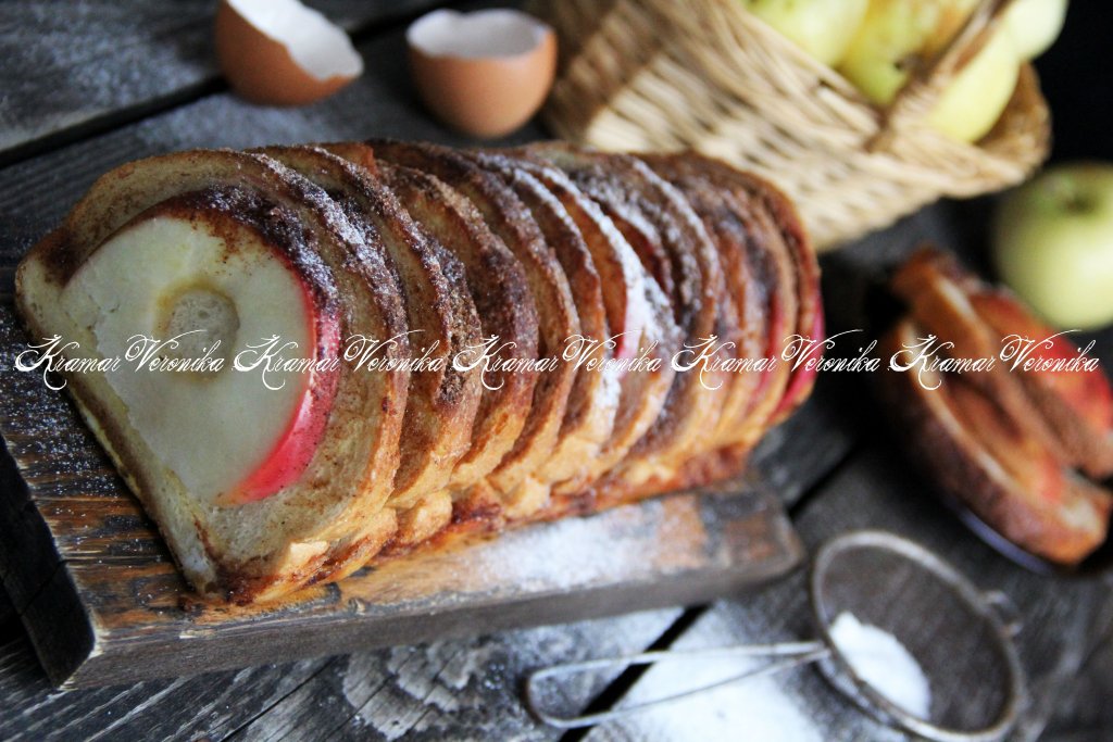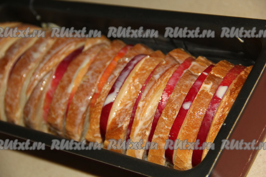 Равномерно залить батон с яблоками яично-молочной заливкой.