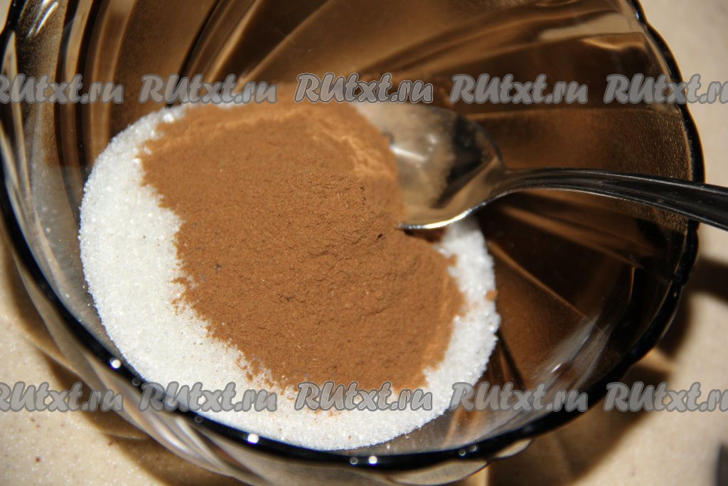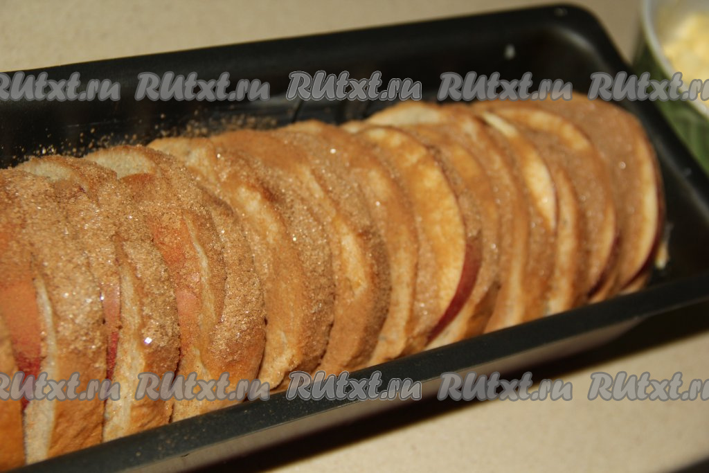 Посыпать сахарно-коричной смесью наш пирог из батона с яблоками.