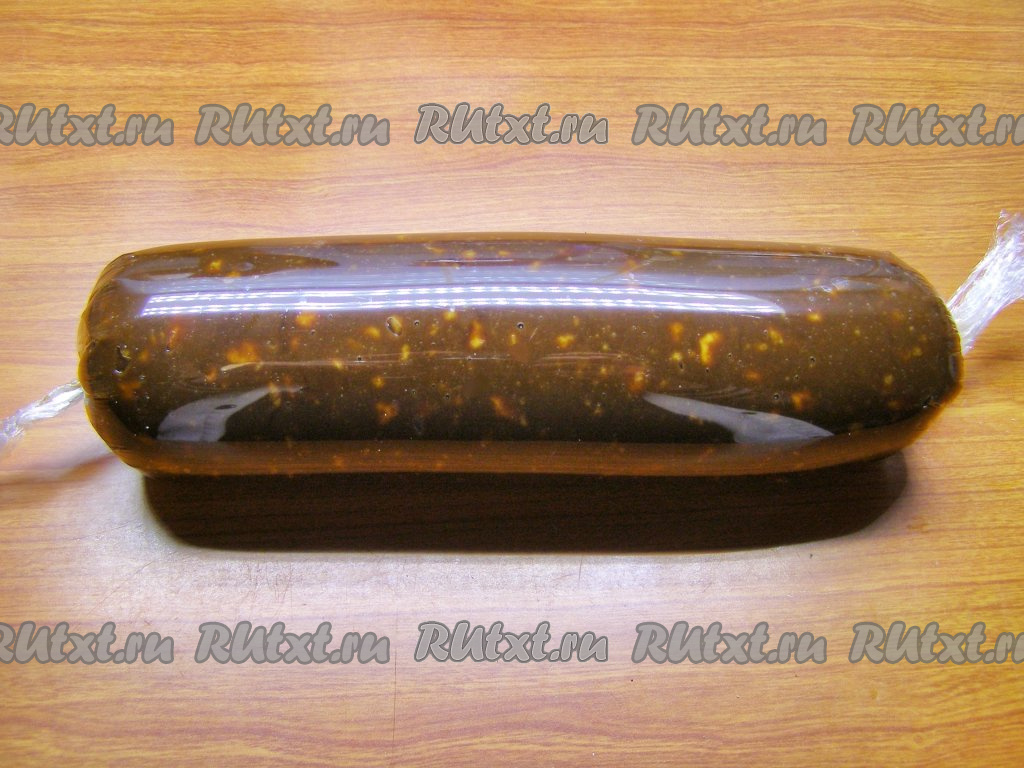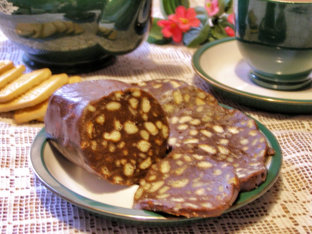 По истечении времени оригинальная, сладкая и вкусная шоколадная колбаска из печенья и какао готова. Нарезаем её тонкими ломтиками, как обычную колбасу, и подаём к чаю или кофе.