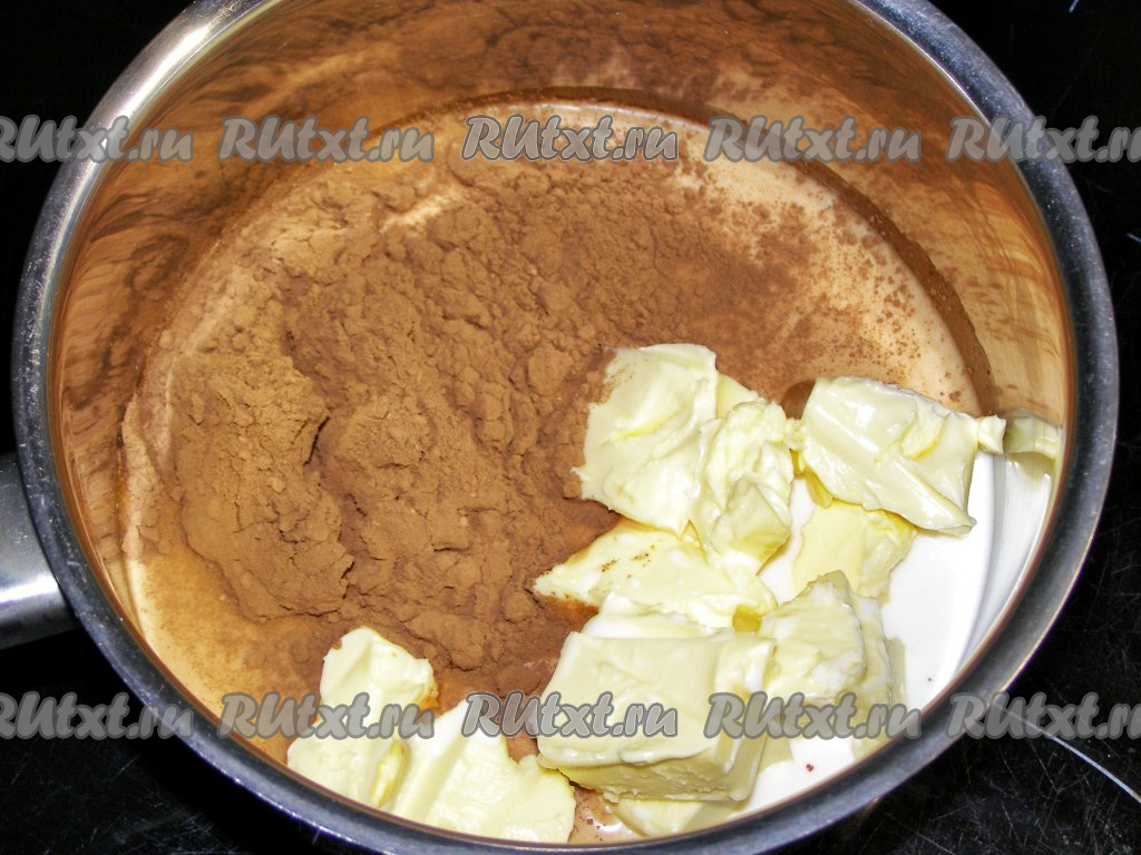 В кастрюлю с маслом, какао и сахаром вливаем молоко и ставим на средний огонь. Варим, помешивая, пока масло не растает.
