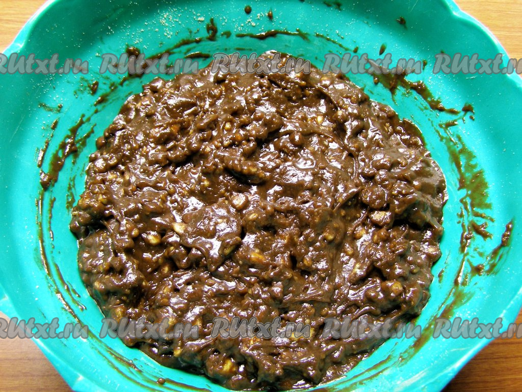 Переливаем массу в миску с раскрошенным печеньем и перемешиваем ложкой. Смесь должна получиться достаточно вязкой. Если вам кажется, что смесь получается сухой, добавьте совсем немного тёплого молока, если кажется жидкой, добавьте в массу ещё немного измельчённого печенья.