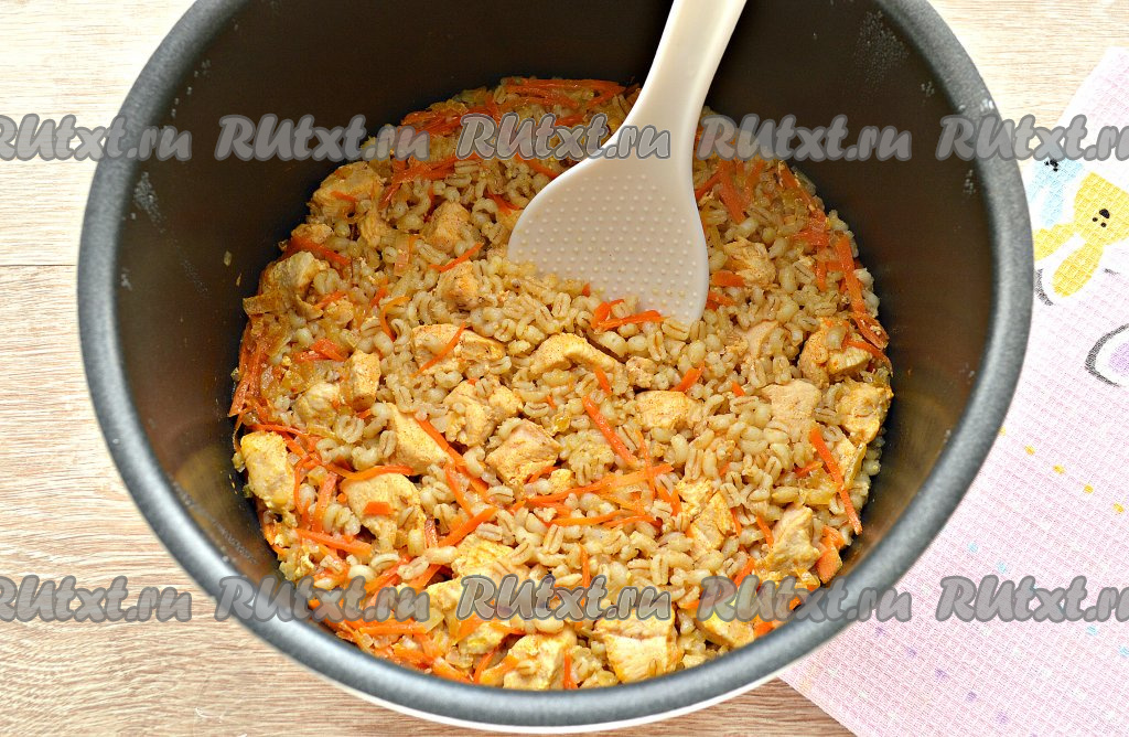 Влить к перловке с курицей кипячёную воду. Я влила 2 стакана воды, поэтому у меня перловая каша получилась рассыпчатой. Если желаете, чтобы перловка получилась вязкой консистенции, то увеличьте количество жидкости, добавив в общей сложности 2,5 стакана воды. Программу «Жарка» отключить, установить «Тушение».