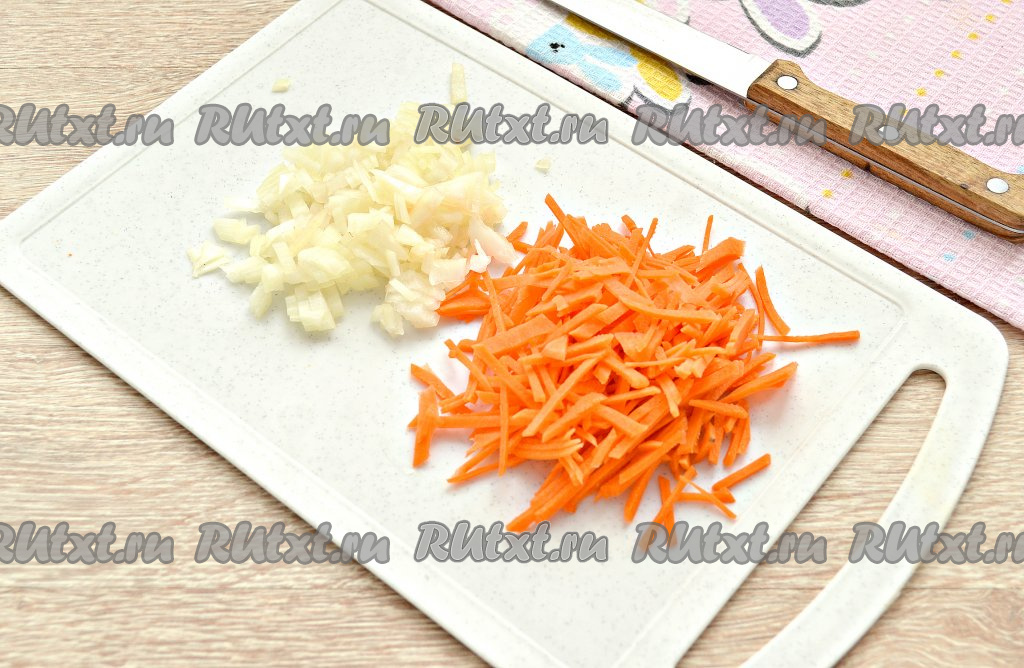 Очистить морковку, нарезать мелкой соломкой (можно натереть и на крупной тёрке). Очищенную луковицу нарезать на небольшие кубики.