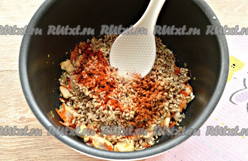 Выложить к ингредиентам в чашу подготовленную перловку, посолить, сдобрить по вкусу паприкой и молотыми специями (я использовала готовую приправу для куриных блюд, можно взять смесь молотых перцев), перемешать.