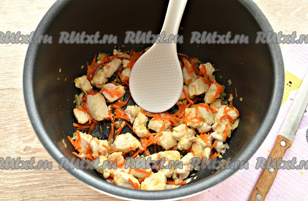 3 столовые ложки растительного масла влить в съёмную чашу мультиварки. Включить программу «Жарка». Поместить в чашу нарезанные морковку и лук, обжарить, помешивая, минуты 3. Затем добавить кусочки курочки, перемешать и обжаривать с овощами в течение 7 минут, не забывая периодически перемешивать.