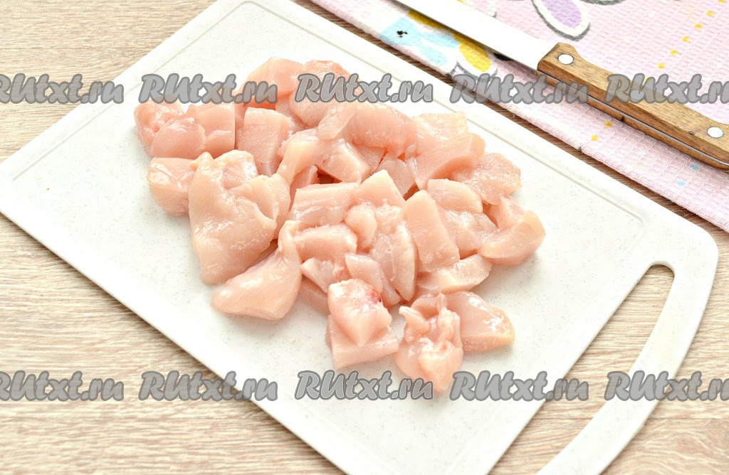 Куриное мясо промыть и отделить от костей, обсушить бумажным полотенцем. Я брала куриное филе. Нарезать куриное мясо на небольшие кусочки.