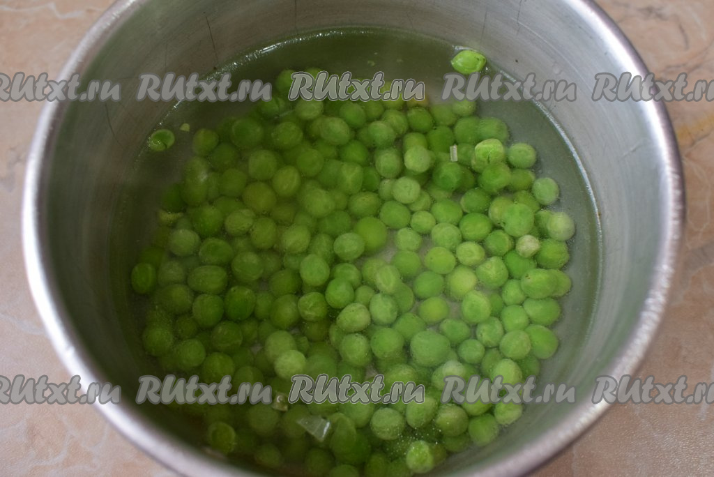 Если зелёный горошек свежий, то его можно сразу добавлять в блюдо. Если замороженный - необходимо, не размораживая его, выложить в кипящую воду, дать закипеть, а затем проварить 4-5 минут и слить лишнюю воду.