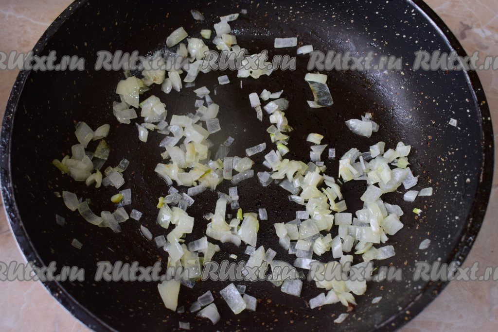 Налейте немного растительного масла на сковороду, разогрейте до горячего состояния, после этого выложите очищенный и достаточно мелко нарезанный лук, обжарьте его до прозрачности на среднем огне (в течение 2-3 минут), не забывая периодически перемешивать.