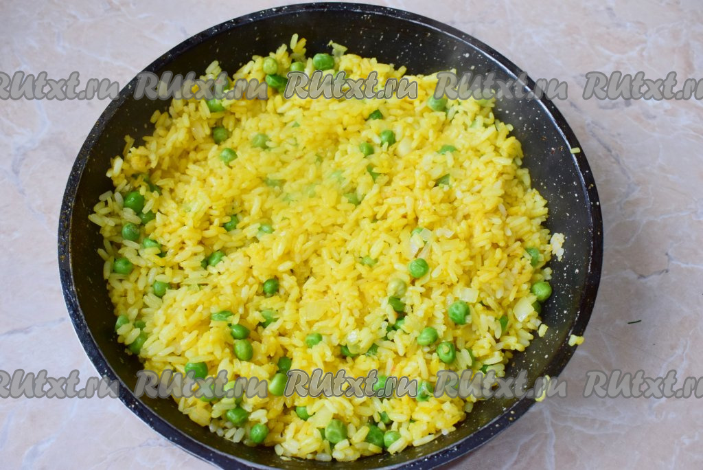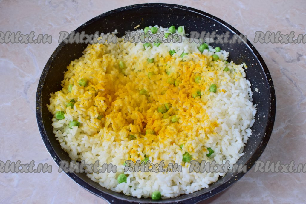 Затем выложите отваренный рис, добавьте специи и куркуму, подсолите по вкусу и хорошо перемешайте, подержите на умеренном огне минуты 2-3, чтобы блюдо прогрелось.