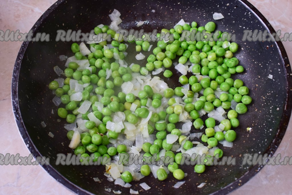 Добавьте в сковороду свежий (или предварительно отваренный) зелёный горошек, перемешайте его с луком и прогрейте в течение минуты, помешивая.