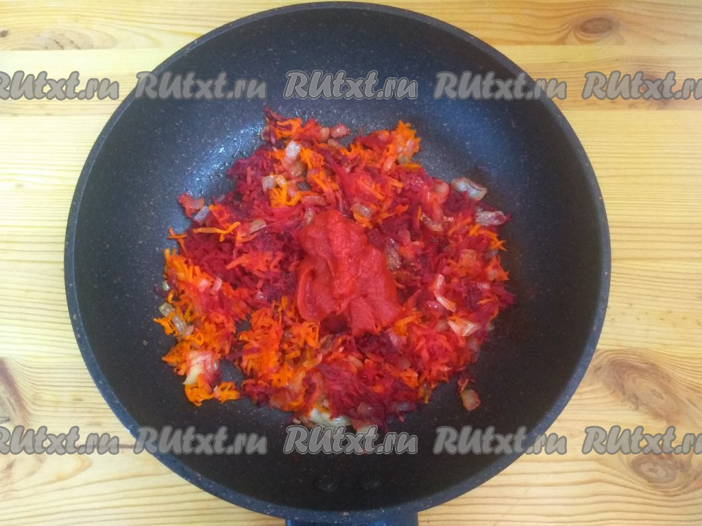Затем добавить к обжаренным овощам томатную пасту, перемешать и прогреть в течение 1 минуты.