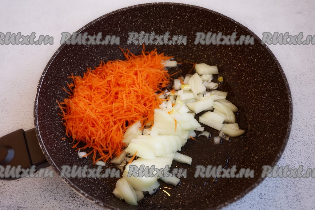 Вливаем в сковороду 30 мл растительного масла и отправляем туда лук и морковь. Обжариваем на среднем огне, помешивая время от времени, примерно, 5-6 минут (практически до готовности).