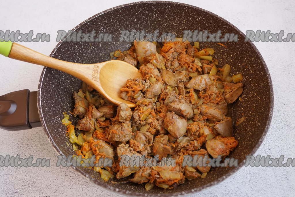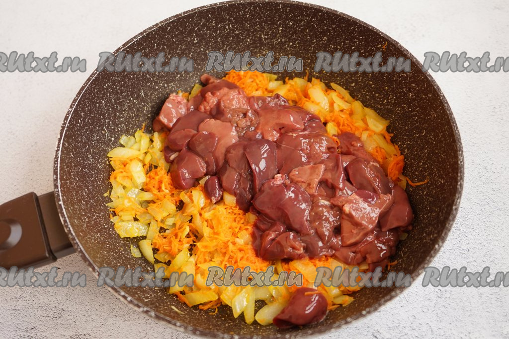 Выкладываем куриную печень на сковороду с обжаренными овощами, перемешиваем. Помните, солить сырую печень нельзя - так она становится жёсткой. Присыпать солью и специями будем уже практически готовое блюдо.