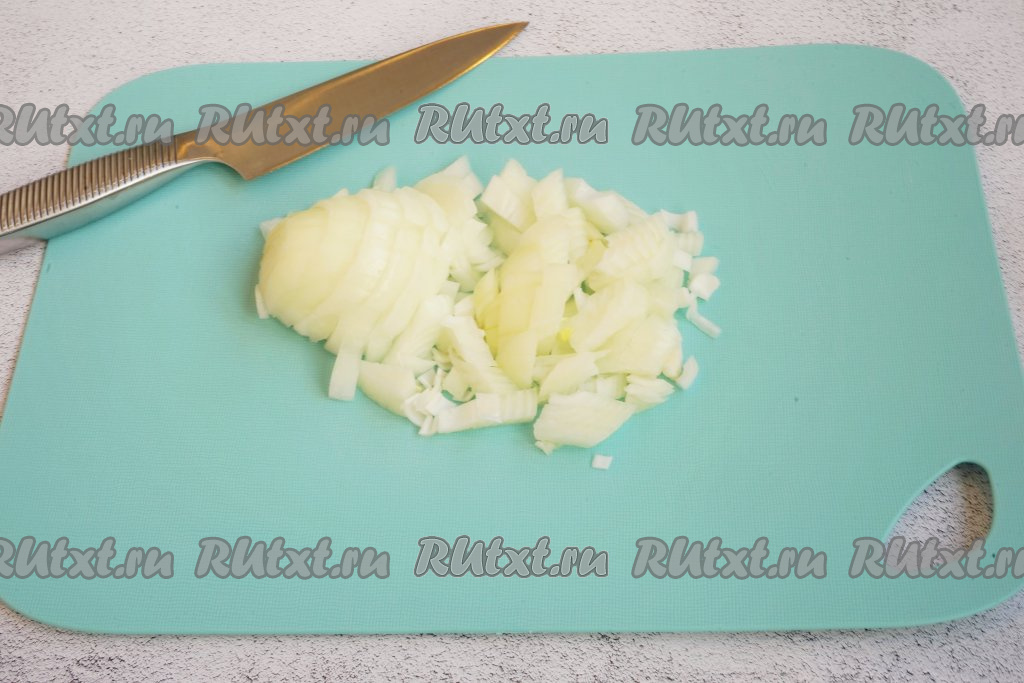 Сливочное масло нужно заранее достать из холодильника, чтобы оно согрелось при комнатной температуре и стало более мягким. Приготовление нежнейшего паштета из куриной печени начинаем с того, что очищаем луковицу и нарезаем её небольшими кусочками.