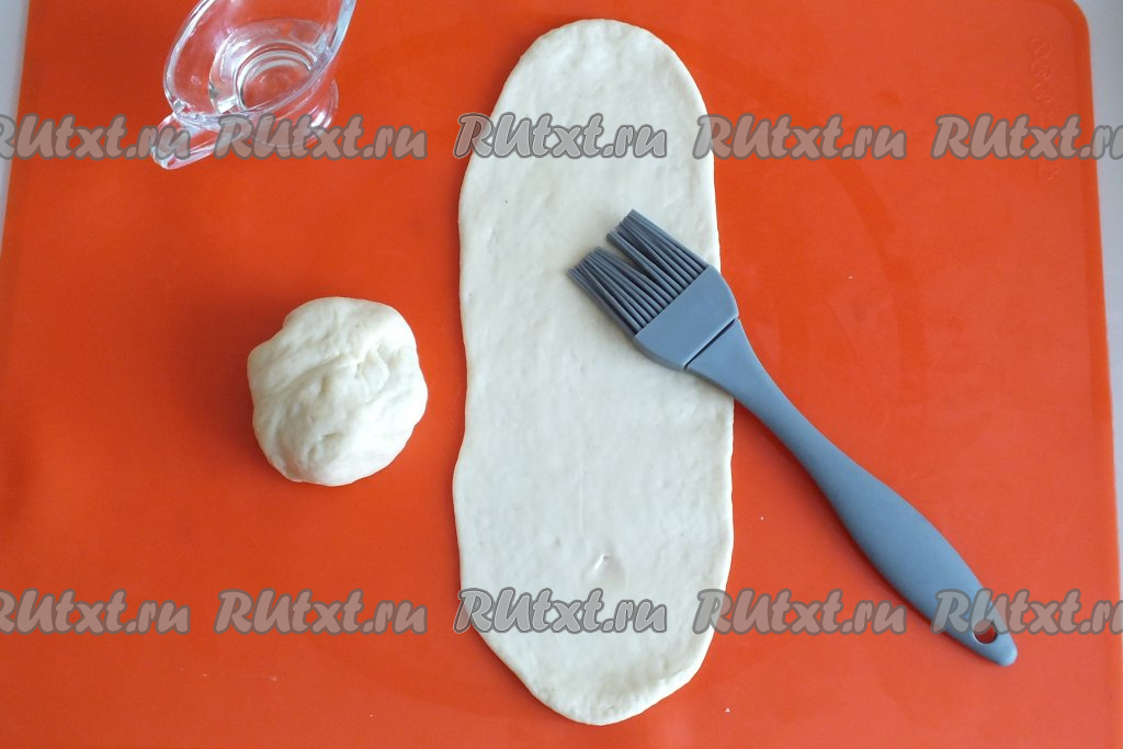 Теперь возьмите 2 получившиеся половинки. Каждую половинку раскатайте в пласт длиной 16 см и шириной 10 см, смажьте растительным маслом.