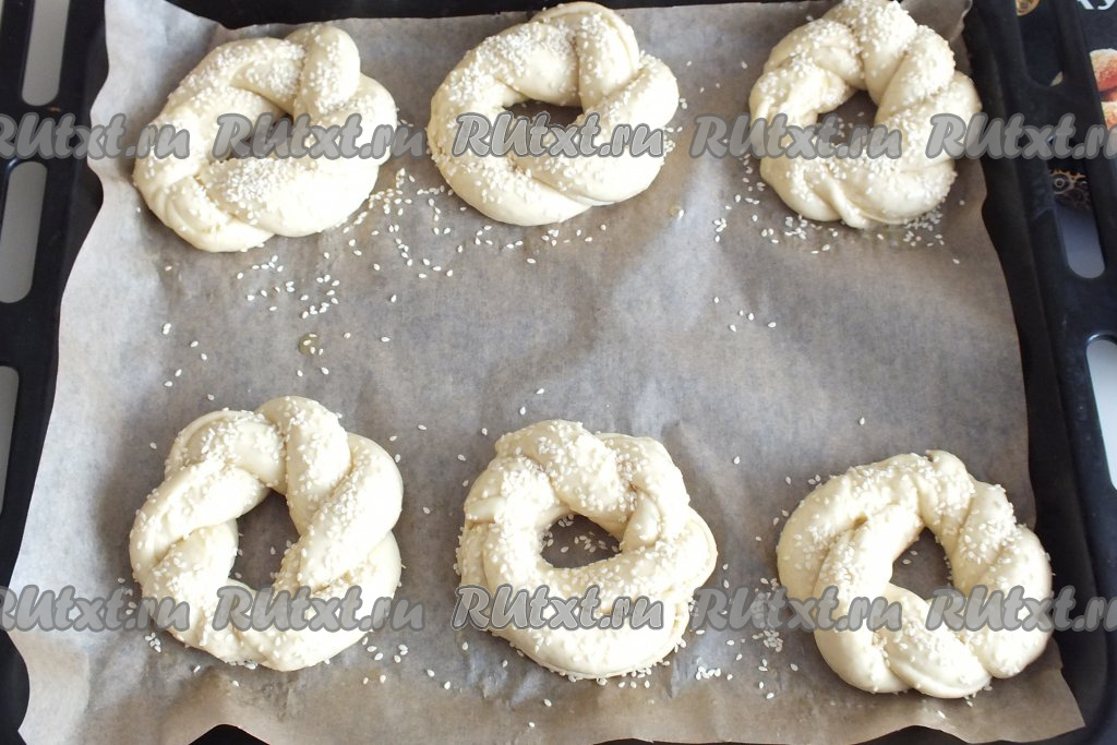 Аналогично сформируйте заготовки турецких булочек из оставшихся частей теста. У нас получатся 6 заготовок, выложите их на противень, застеленный бумагой, на расстоянии друг от друга. Смажьте взбитым яйцом, посыпьте кунжутом и оставьте на 10 минут. После поставьте в разогретую до 180 градусов духовку на 20 минут.
