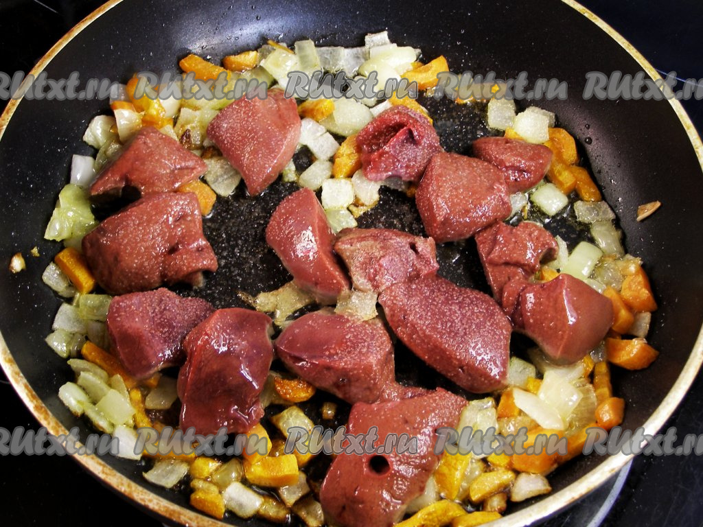 В сковороду с обжаренными овощами выкладываем кусочки свиной печени, слегка посыпаем солью, перемешиваем и жарим на среднем огне, помешивая, примерно, 10 минут (до готовности печёнки). Готовность печёнки проверить достаточно просто, нужно разрезать кусочек печени и убедиться в том, что в разрезе и в выделившемся соке нет примесей крови.