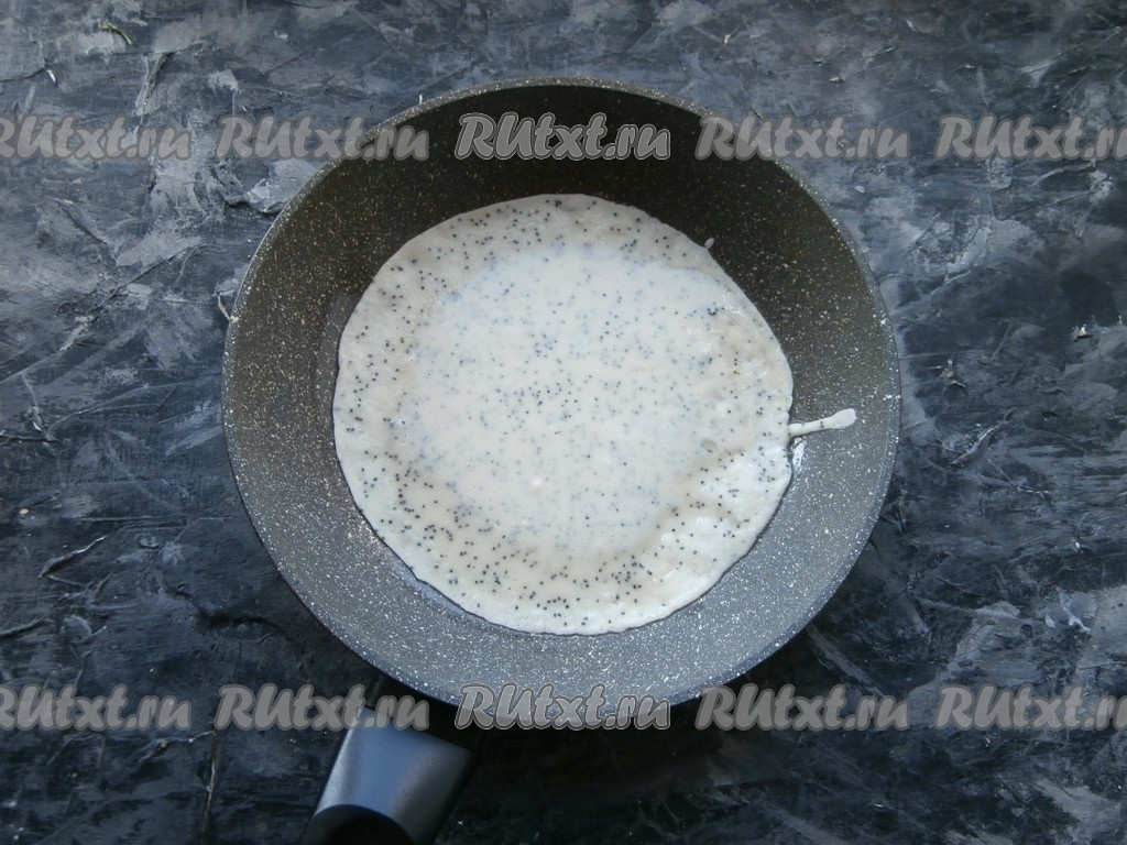 Жарить маковый блинчик, как обычно, на среднем огне до румяности с двух сторон, затем переложить на плоскую тарелку. Сковороду смазывать маслом нужно только для жарки первого блина, остальные маковые блинчики можно жарить на сухой сковороде, огонь держать средний. Пожарить блины из оставшегося теста.