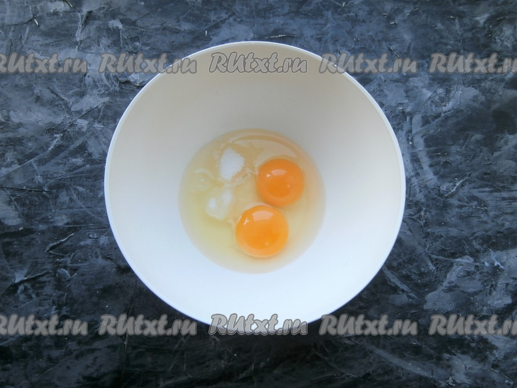 Яйца разбить в достаточно глубокую миску, добавить к ним сахар, соль и ванильный сахар.