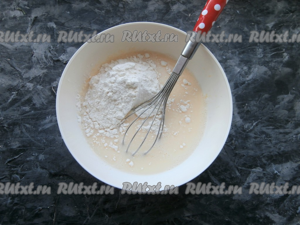 Влить молоко комнатной температуры и хорошо взбить венчиком. Всыпать муку.