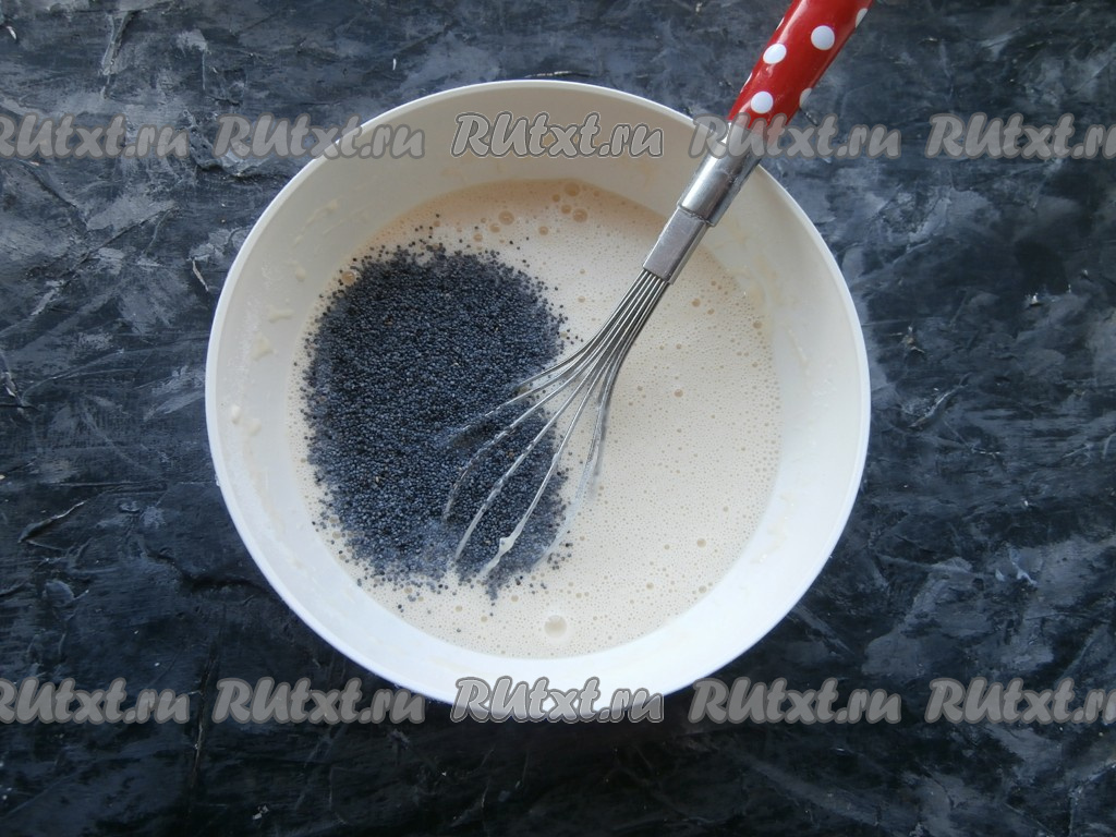 Влить растительное масло и снова хорошо перемешать венчиком блинное тесто. Оно получится не слишком жидким, но и не густым. Оставить маковое блинное тесто при комнатной температуре на 15 минут.