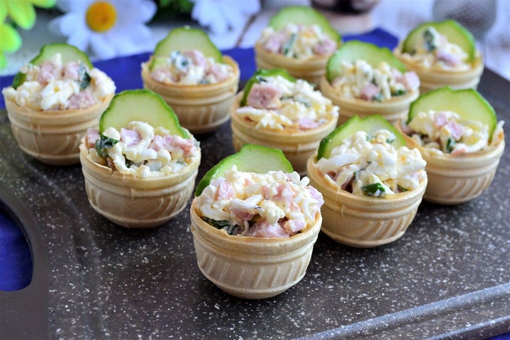 Тарталетки, наполненные ветчиной и сыром, украсить полукружочками свежего огурца и сразу подать на стол. Эта простая закуска отлично смотрится на праздничном столе, а получается настолько аппетитной и вкусной, что съедается одной из первых!