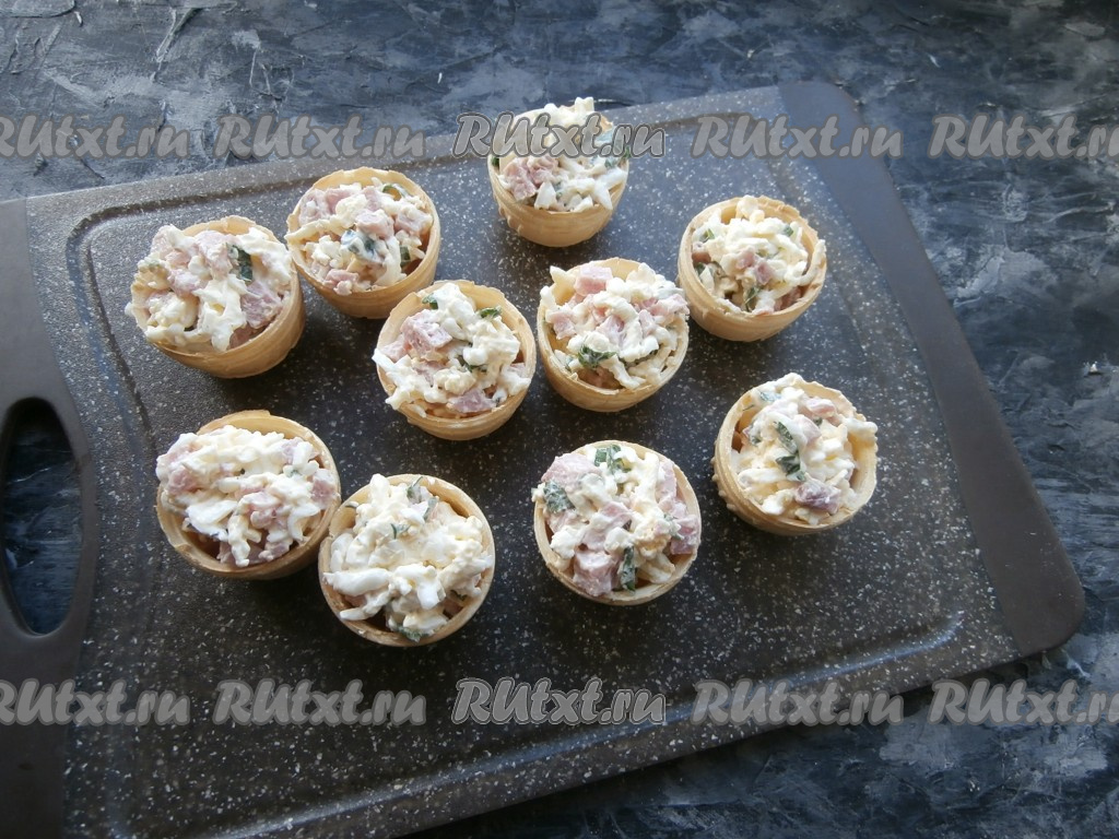 Тарталетки с различными начинками мы часто готовим для праздничного стола и эти закуски всегда съедаются одними из первых. Хочу предложить вам холодную закуску - тарталетки, приготовленные с ветчиной и сыром, - которую очень любят мои родные и гости. Готовится блюдо совершенно просто и быстро. Тарталетки нужно наполнять салатом из ветчины и сыра непосредственно перед подачей на стол. Для этой закуски идеально подойдут вафельные тарталетки, важно - чтобы они были свежими, тогда они будут приятно похрустывать. Приготовьте тарталетки с ветчиной и сыром и они, наверняка, станут частым блюдом на вашем праздничном столе!