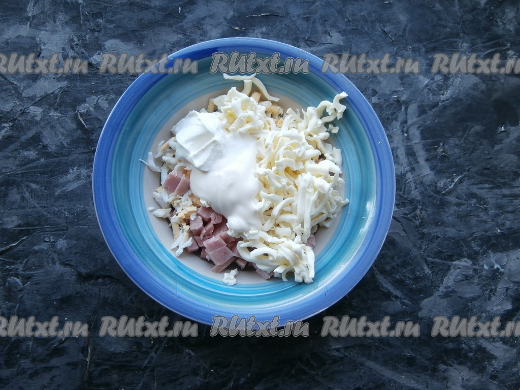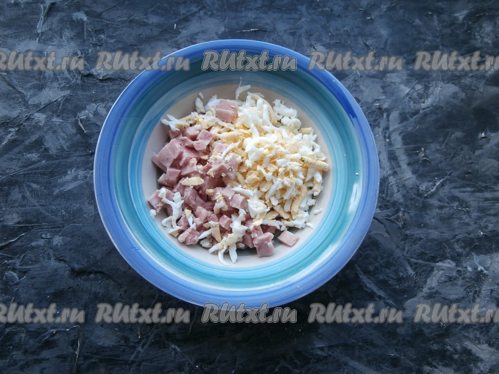 Ветчину нарезать маленькими кубиками, добавить предварительно сваренное вкрутую (варить минут 10 с начала кипения воды), очищенное и натёртое на тёрке яйцо.
