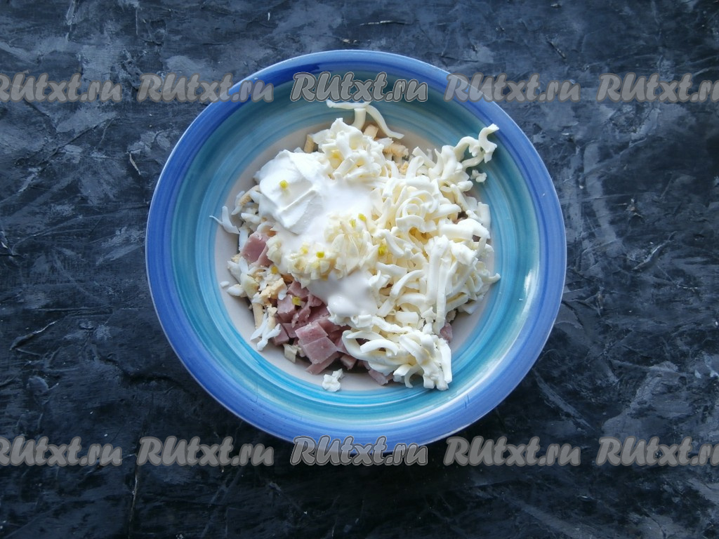 Добавить натёртый на тёрке плавленый сырок, сметану и майонез.