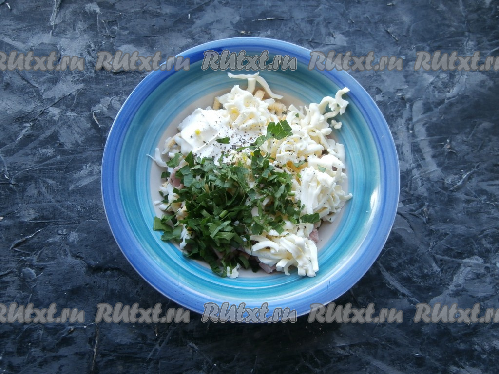 Салат из ветчины, сыра и яйца немного посолить и поперчить, добавить измельчённую зелень петрушки.