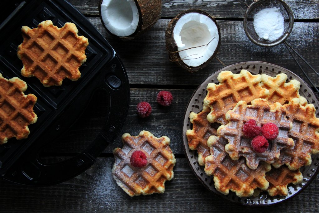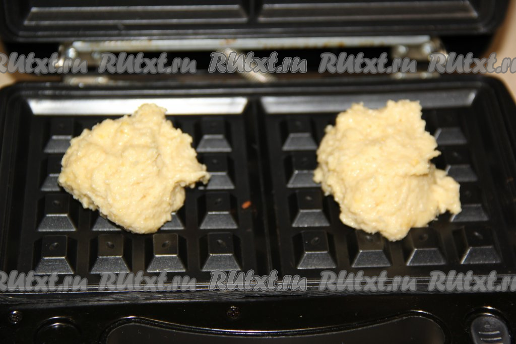 Разогреть электровафельницу. Выложить по одной столовой ложке кокосового теста в вафельницу.