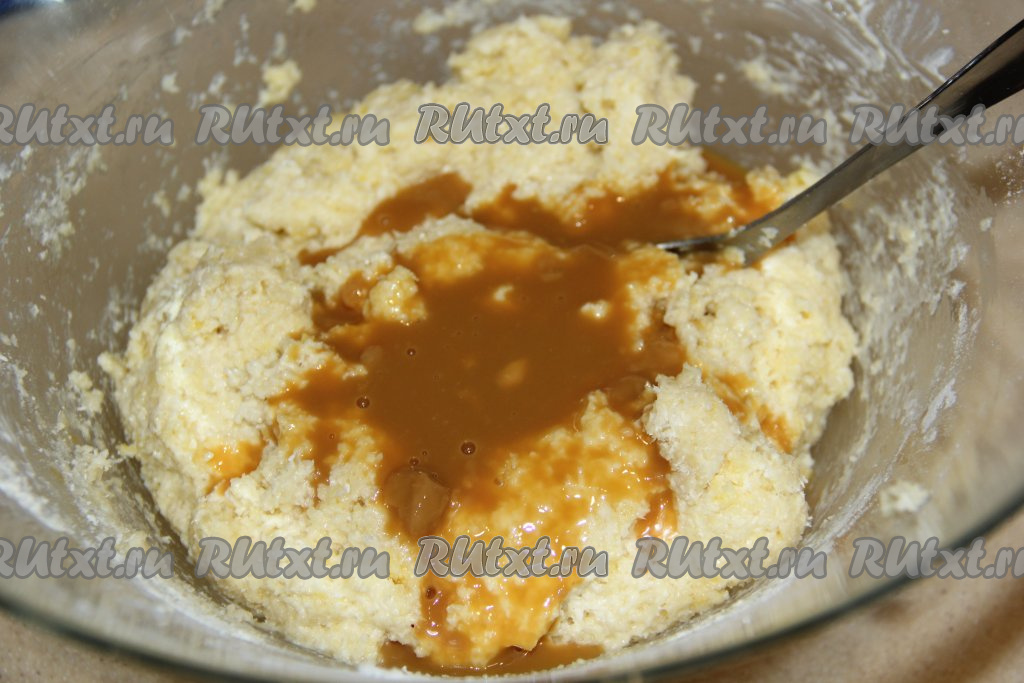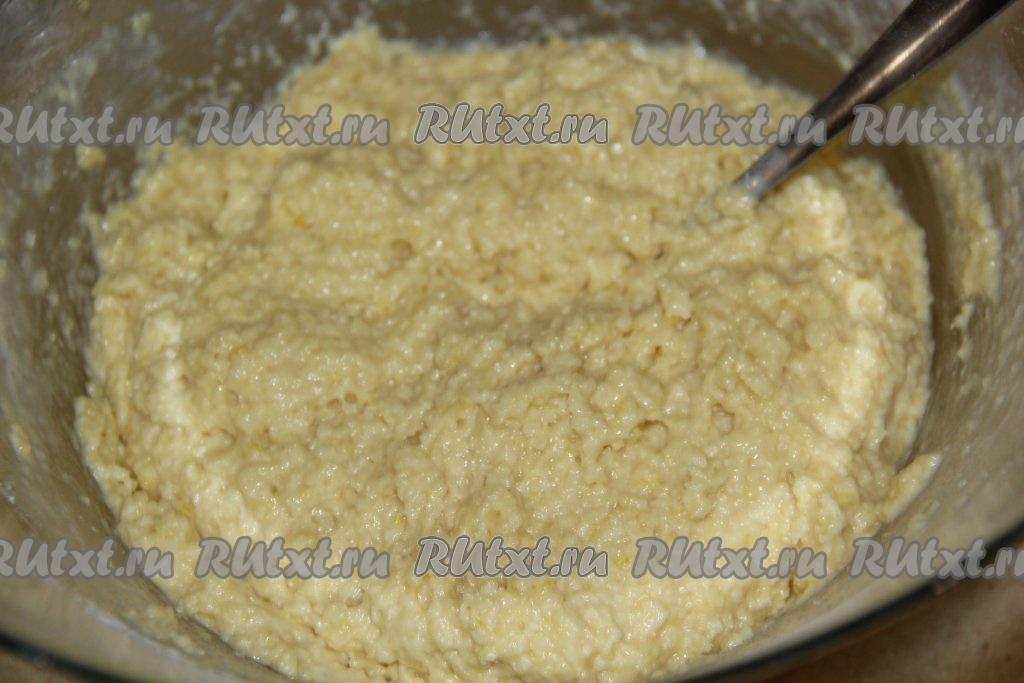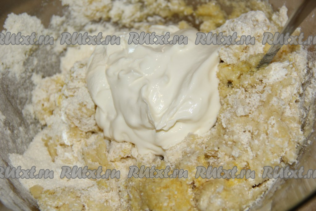 Перемешать получившееся тесто столовой ложкой, добавить сметану, ещё раз тщательно перемешать.