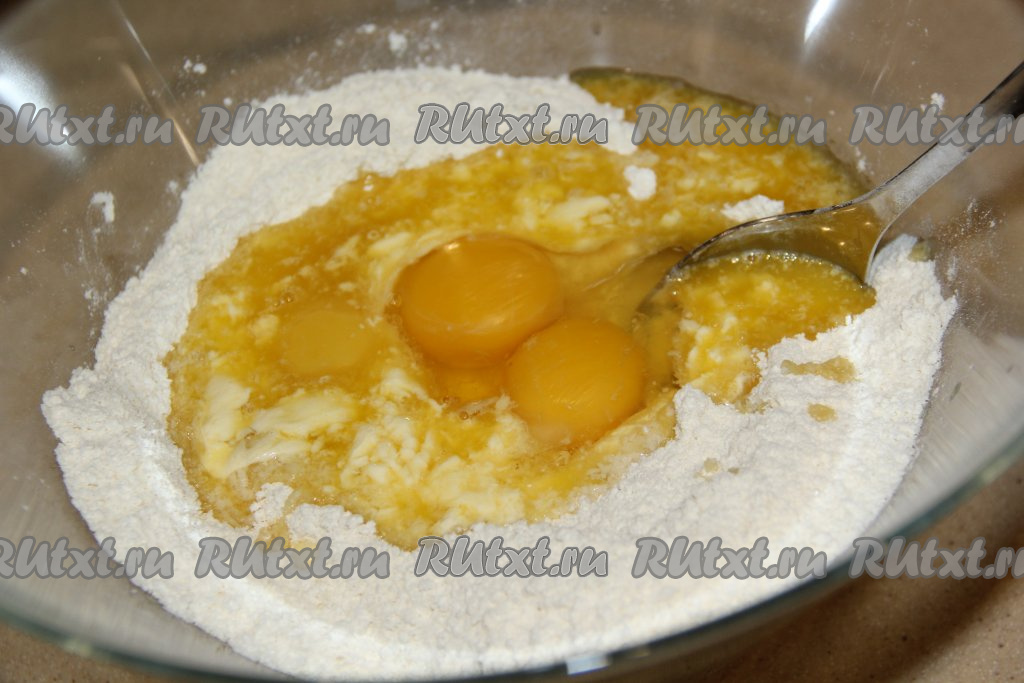В сухие ингредиенты добавить яйца и растопленное не горячее масло.