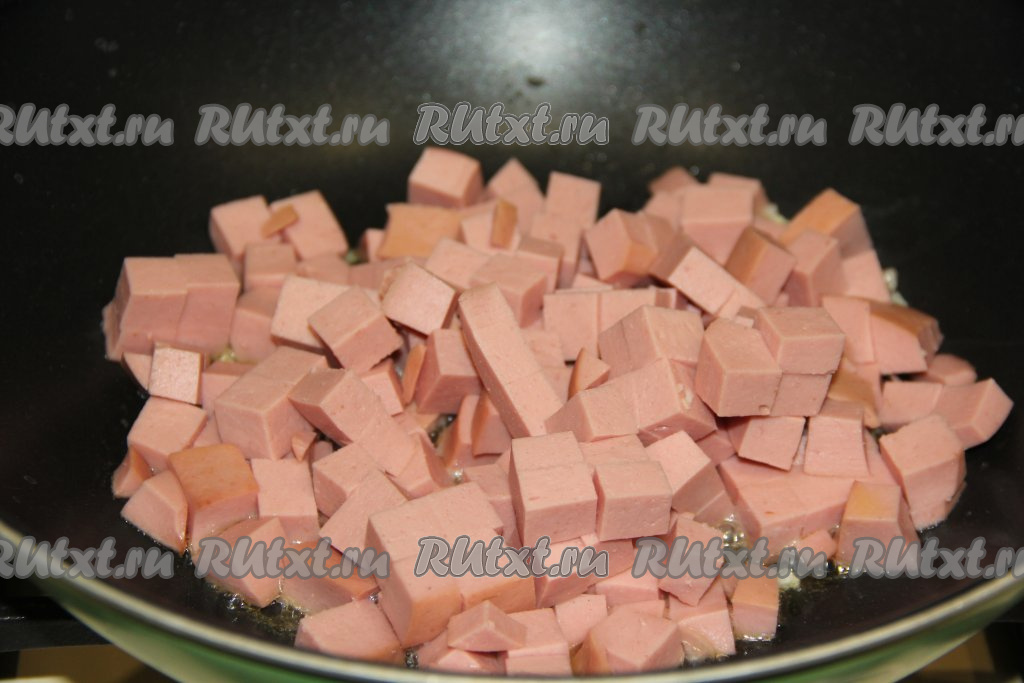 Обжарить колбаску на среднем огне до золотистого цвета, периодически перемешивая.