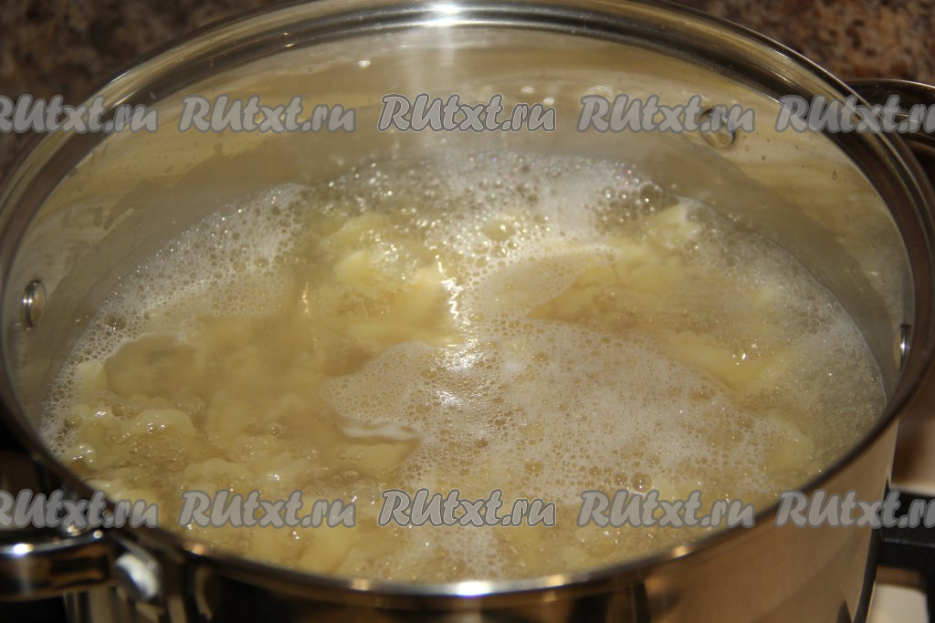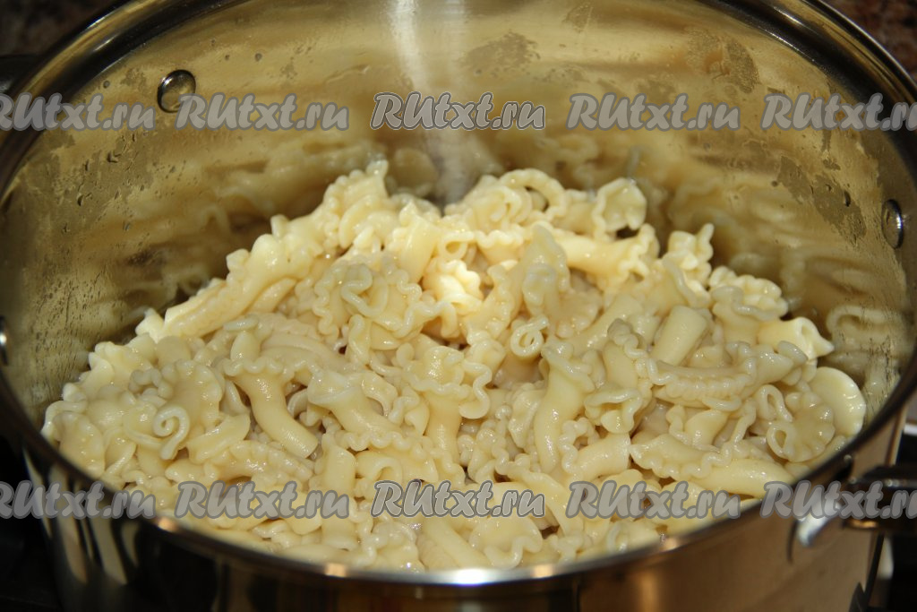 Вскипятить в кастрюле воду, подсолить, выложить в неё макароны, дать закипеть, перемешать, а после этого отварить до готовности (обычно макаронные изделия варятся минут 8-10, но точное время отваривания смотрите на упаковке макаронных изделий, которые вы готовите).