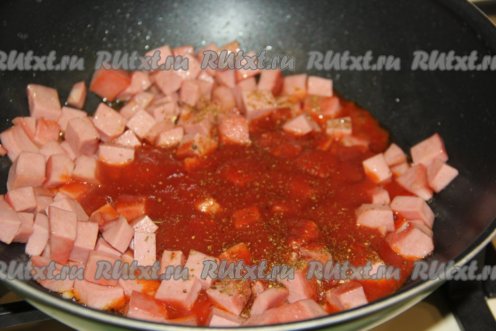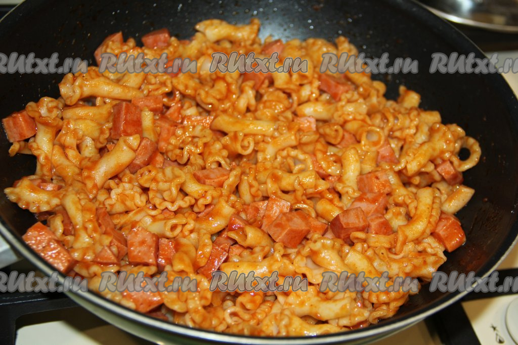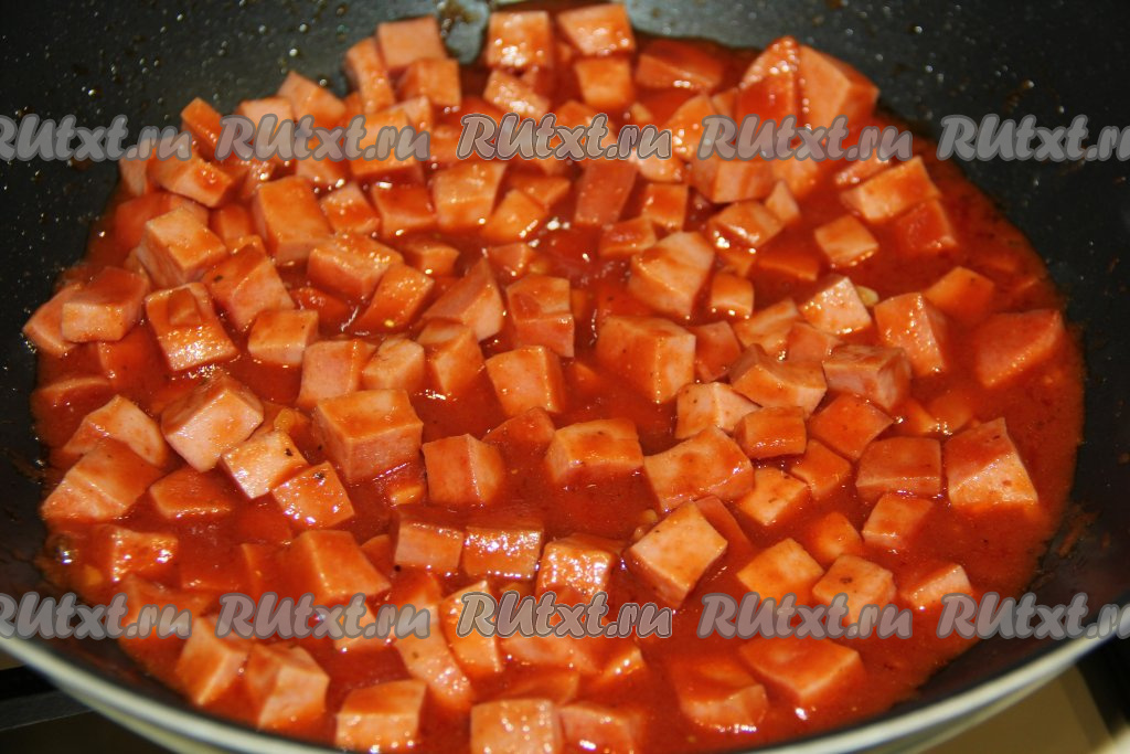 Перемешать колбасу с томатным соусом, дать закипеть, а затем потомить на небольшом огне пару минут.