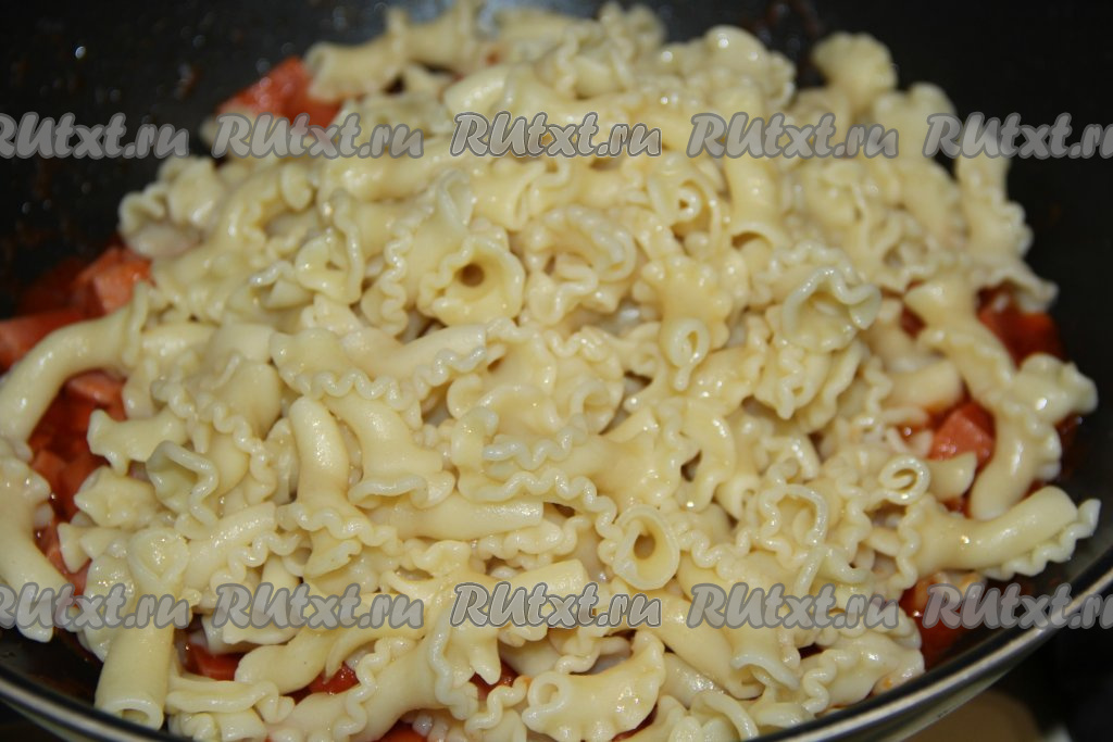 Перемешать макароны с колбасой, потомить на среднем огне в течение 5 минут, затем добавить натёртый на тёрке сыр (немного натёртого сыра можно оставить для подачи), перемешать и выключить огонь.
