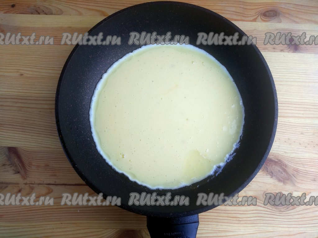 На сковороду налить, примерно, 1 столовую ложку растительного масла, раскалить на сильном огне, вылить яично-кефирную смесь. Накрыть сковороду крышкой, огонь убавить до минимума. Готовить омлет в течение 5-7 минут. На поверхности не должно быть сырой массы. Во время запекания омлет сильно поднимается.