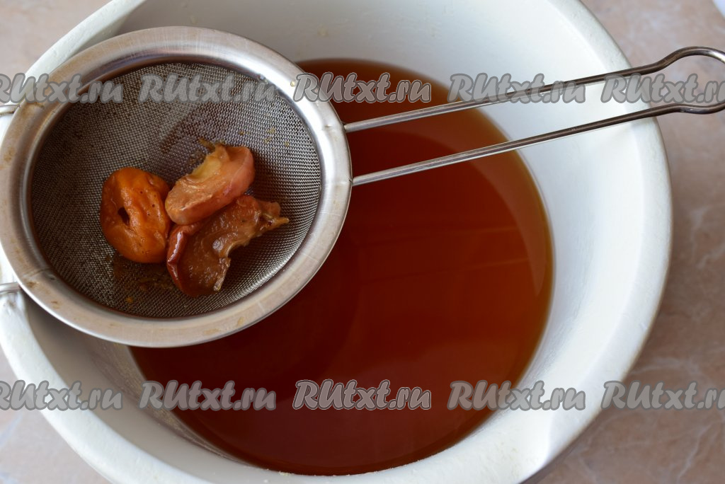Затем горячую воду слейте, а сухофрукты промойте в холодной воде - с них смоется вся пыль. Откиньте сухофрукты на дуршлаг и дайте воде стечь.