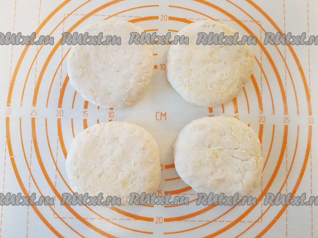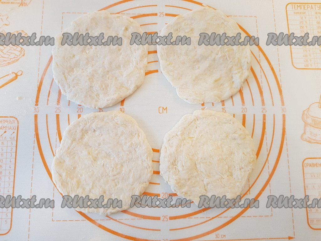Далее получившееся тесто разделить на 4 части. На столе, присыпанном мукой, каждую часть теста размять руками, придав ей округлую форму диаметром, примерно, 12-13 см.