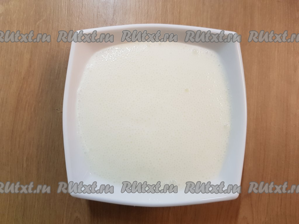В отдельную тарелку налить кефир, добавить к нему соду и хорошо перемешать (на поверхности кефира должны появиться пузырьки).