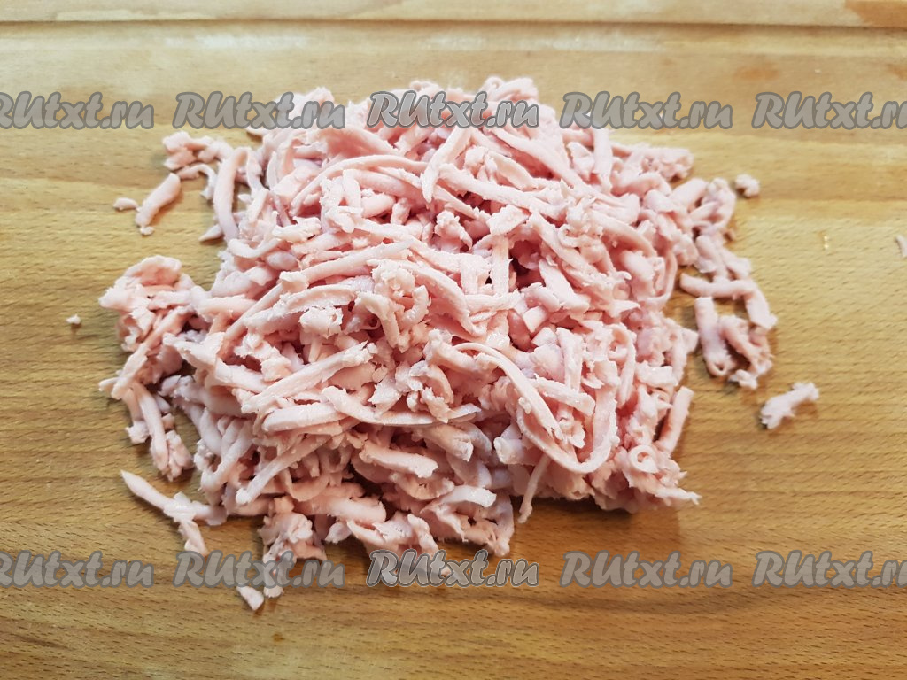 На крупной тёрке натереть варёную колбасу (или сосиски).