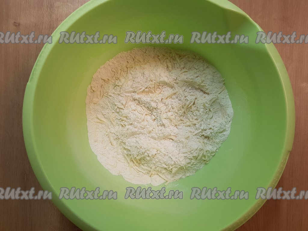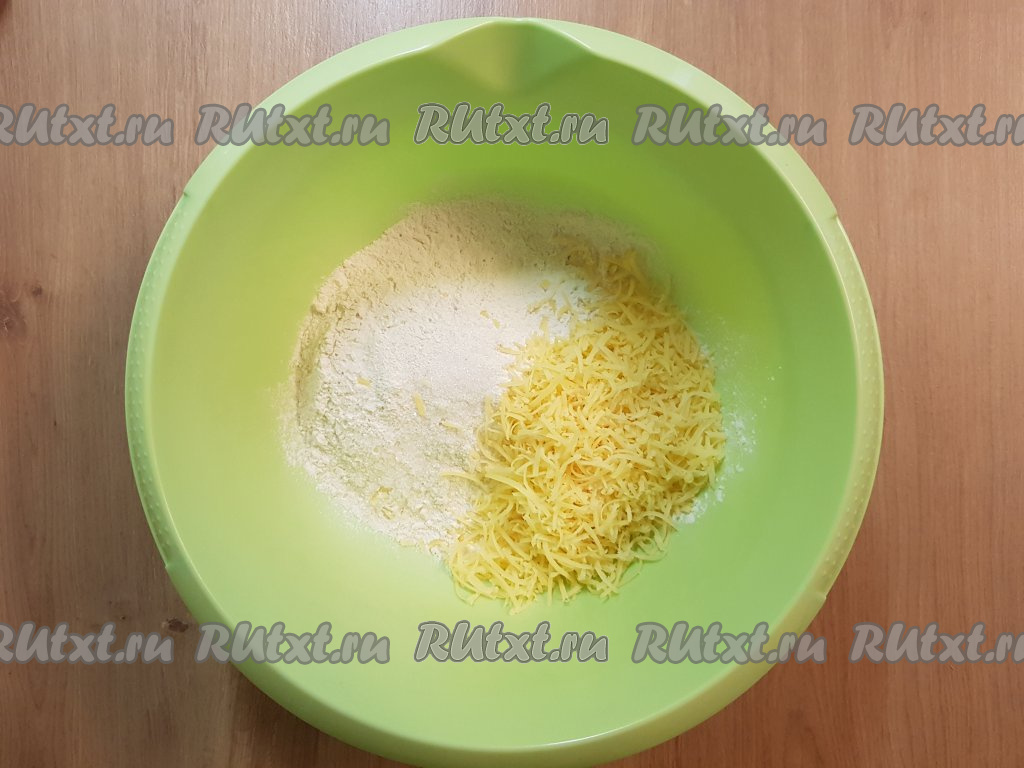 Для замешивания теста в глубокую миску выложить муку, соль, сахар, натёртый на мелкой тёрке сыр.