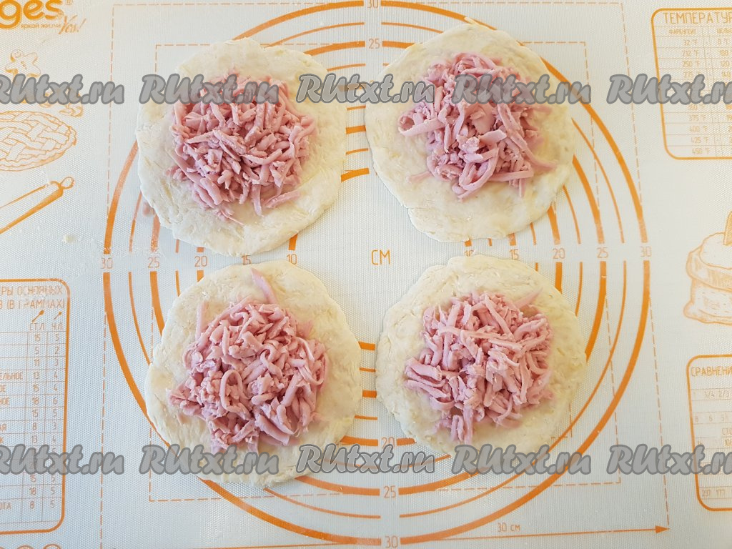 Натёртую колбасу (или сосиски) разделить на 4 равные части и выложить в центр каждого кружочка.