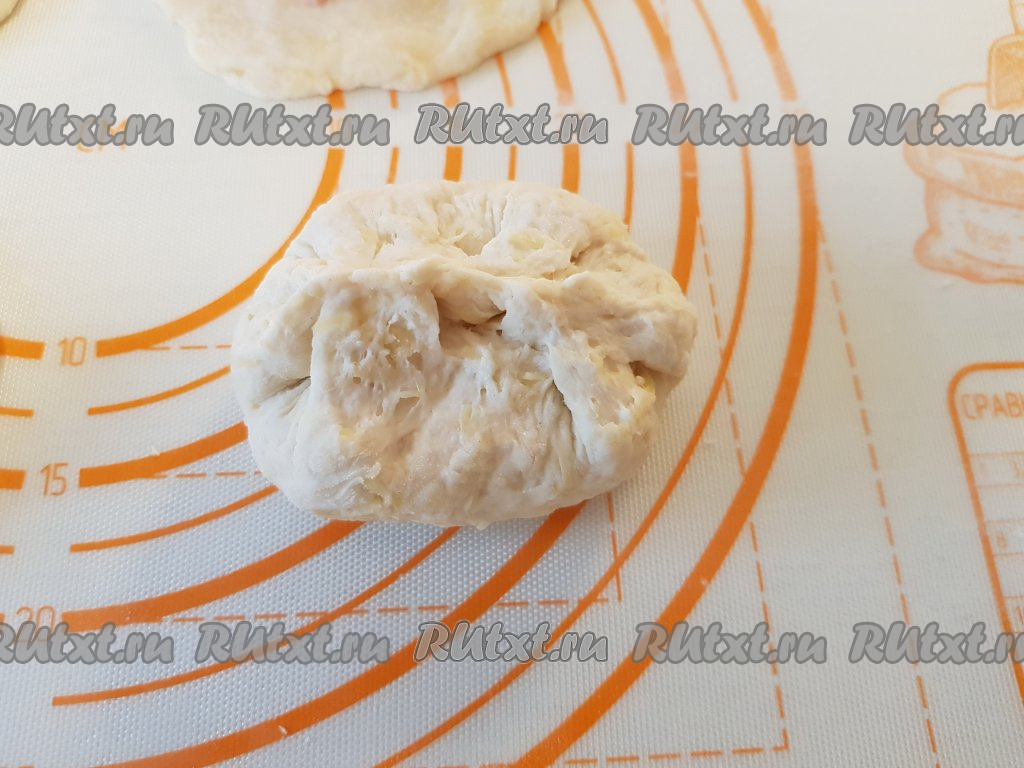 Перевернуть заготовку лепёшки швом вниз и прижать, формируя плоскую лепёшку.